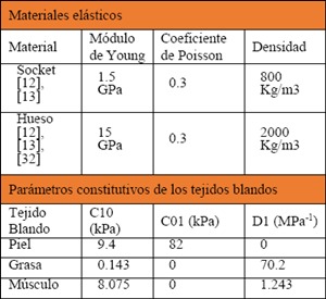 Para las propiedades mecánicas de los materiales que componen el sistema socket – muñón, se asumieron modelos elásticos-lineales para el hueso y el socket como es sugerido por [12, 13, 14] (Ver Tabla 1). Los tejidos blandos (músculo, grasa y piel) se modelaron como materiales hiperelásticos de acuerdo con [15, 16, 17, 18, 19, 20, 21, 22, 23, 24, 25, 26, 27, 28, 29]. El comportamiento de los tejidos blandos fue definido mediante la función de energía de deformación de Mooney Rivlin [30] implementada en Ansys versión 14, donde los parámetros constitutivos C10, C01, D1 utilizados se muestran en la Tabla 1. Para todos estos se consideró un coeficiente de Poisson 𝜈=0.49 y se tomó la densidad de la piel como 1100 Kg/m3, la densidad del músculo 1064 Kg/m3 y la densidad del tejido graso como 900 Kg/m3 [31].