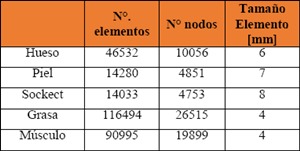 Después de tener definida la geometría, las propiedades mecánicas y las condiciones de borde, se realizó el mallado del dominio del problema, en este caso, debido a la complejidad del fémur, se emplearon elementos tetraédricos, y para los demás elementos se utilizaron elementos hexaedrales. Los datos de número de nodos y el tamaño y número elementos empleados en los modelos se encuentran en la Tabla 3.