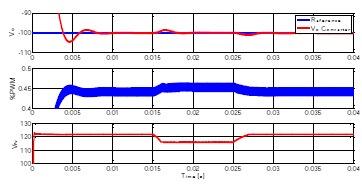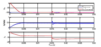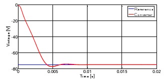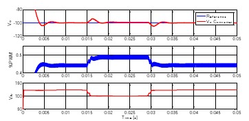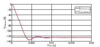 En la Figura 8 se observa la respuesta del convertidor ante una referencia de −125𝑉𝐷𝐶 donde se presenta un sobrepaso cercano al 8%, y un tiempo de establecimiento inferior a 8 𝑚𝑠, lo que implica que a pesar del cambio del punto de operación del convertidor el controlador mantiene buenos índices de desempeño.