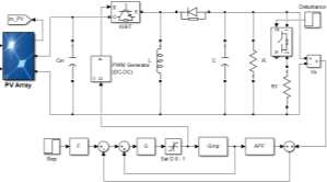 El esquema de control robusto, se valida utilizando técnicas de diseño basado en modelo bajo el entorno de Simulink de Matlab® y con el apoyo de la Toolbox Simscape para el modelamiento de sistemas físicos. En el modelo de simulación se cuantificó la lógica propuesta por el control robusto para generar una señal PWM de 100 𝐾𝐻𝑧 con ciclo de trabajo en función de la acción de control, donde se aplica a la puerta de un MOSFET canal N. El controlador se implementa a partir de las funciones de transferencia en tiempo continuo. El generador fotovoltaico se modela a partir de las ecuaciones propuestas en [8] y el modelo de simulación Renewable Energy Systems documentados en la Toolbox Simscape de Mtalab®. El modelo de simulación se muestra en la Figura 6.