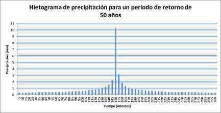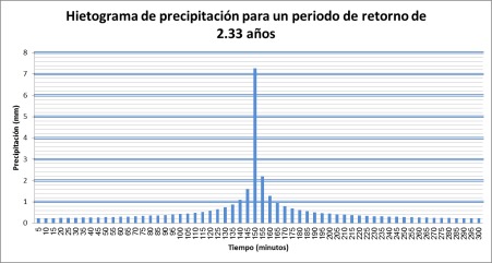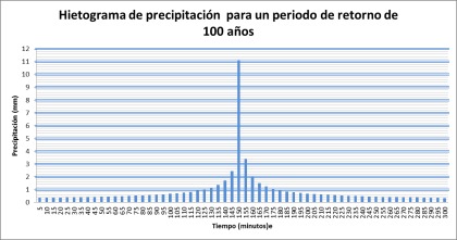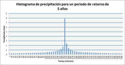 (8)Teniendo la ecuación de intensidad para la microcuenca, se dio lugar a la elaboración de los hietogramas de precipitación para los periodos de retorno establecidos y con una duración de la lluvia de 300 minutos, esto como resultado de observaciones periódicas de tiempo en el área de estudio.