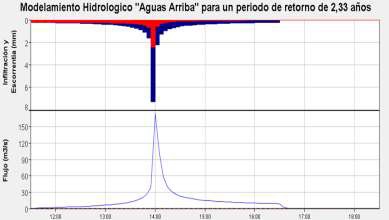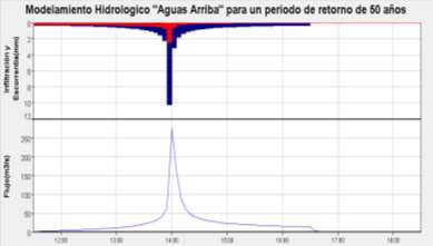 Los datos pluviométricos de cada hietograma se manipularon mediante el software [11] HEC-HMS (Hydrologic Engineering Center's Hydrologic Modeling System) simulando parámetros de escorrentía máxima para un periodo de control de 7 horas. [12] ,[13] Los criterios utilizados dentro del modelamiento fueron los planteados por SCS tanto para las perdidas (C/N) como para la transformación de la precipitación en caudal, con el flujo de diseño estimado y constante durante la corrida del modelamiento hidrológico. Este procesamiento facilito la estimación de los hidrogramas de crecidas para cada periodo de retorno.