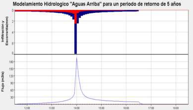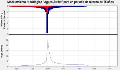 (9)El intervalo de figuras 9 a 13 permite una representación gráfica del comportamiento final del agua una vez que se ha precipitado sobre la microcuenca los cojos. Los hidrogramas de crecidas están dados para cada intervalo de tiempo y en función de los parámetros de infiltración - escorrentía graficados en la primera sección de la figura y la cantidad de flujo transportado por la quebrada La Virgen en la parte inferior de la misma. En este caso se tomaron los resultados obtenidos por el modelamiento“aguas arriba”, con el fin de utilizar los registros del flujo reportados en la cota de entrada inicial del cauce (Figuras 9, 10, 11, 12 y 13).