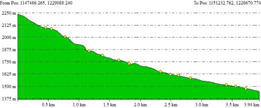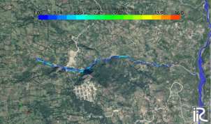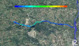 Los registros con mayor velocidad encontrados dentro de la simulación para este periodo de retorno corresponden a la tramo más pendiente de la quebrada, es decir los primeros 1.000 m de recorrido en donde se pueden apreciar velocidades de hasta 14.4 m/s en 2.61 horas de precipitación (ver Imagen 3).