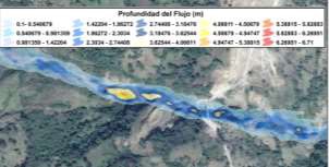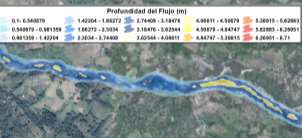 La Figura 14 muestra gráficamente los sectores con mayor profundidad a lo largo del cauce de la quebrada la Virgen, siendo 5.34 m el registro más representativo dentro de la simulación para el primer periodo de retorno trabajado.