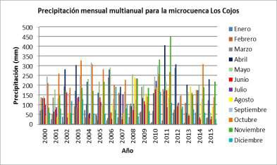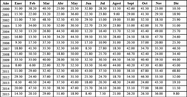 La información meteorológica se trabajó a partir de los regímenes de precipitación registrados en el sector (Ver tabla 4) y a modo de interpolación utilizando la herramienta Spline del Software Arc Gis. V.10.3. Los resultados de la interpolación para cada mes se pueden observar en la tabla 5.