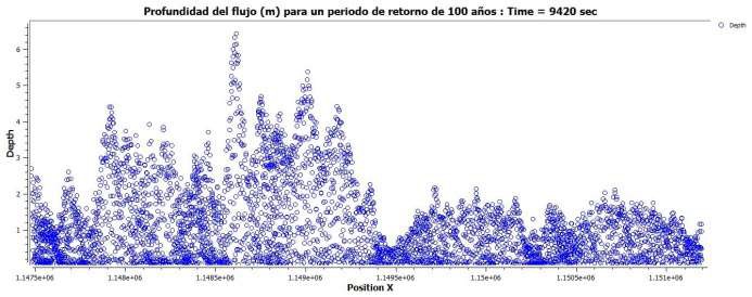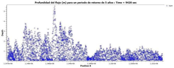 Bajo el modelo correspondiente al periodo de retorno de 5 años se registraron profundidades máximas de 5.6 m tal y como se puede observar en la Imagen 4 y Figura 15.