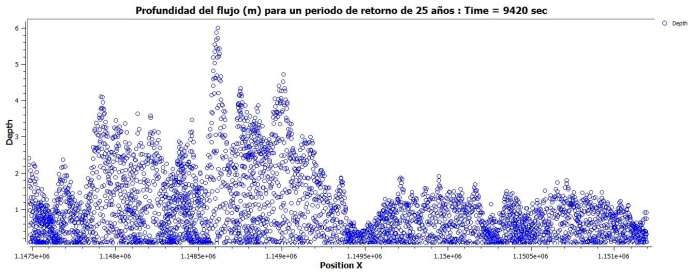 La profundidad máxima registrada bajo este modelo es igual 6.44 m tal y como se puede observar en la imagen 8 donde el caudal circulante alcanza una ocupación total de 25.05 ha, asimismo, la figura 17 indica el comportamiento del flujo a lo largo del cauce mediante la interpretación de sus respectivas ordenadas y abscisas.