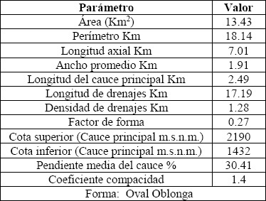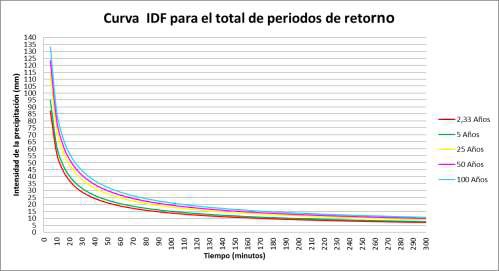 Para analizar el comportamiento de estos datos meteorológicos, se trabajó con base en la [10] distribución de probabilidades pluviométricas de Gumbel en función de los meses más lluviosos, dando como resultado las curvas de Intensidad –Duración y Frecuencia (IDF). Las curvas IDF aportaron dentro de la investigación una lluvia media de intensidades de los eventos máximos, en cada uno de los periodos de retorno establecidos (2.33, 5, 25,50 y 100 años). Después de obtener los valores de las intensidades para cada periodo de retorno, y con los parámetros morfométricos calculados, se halló el valor de la precipitación en 24 horas (mm) multiplicando la duración de la tormenta (h = 5) por la intensidad de la lluvia (mm/h) en intervalos de tiempo de 5 min,