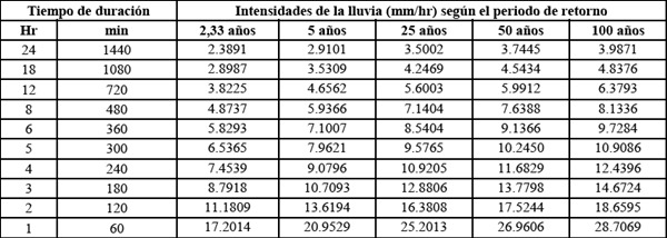 de (2.33, 5, 25, 50, 100, años) y el tiempo de duración de precipitación