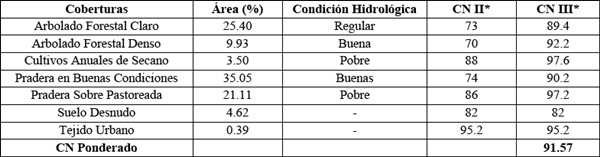 El porcentaje de ocupación de estos polígonos facilito determinar el número de curva ponderado (CN) con un estado III de humedad del suelo para el total de la microcuenca, este CN asume diferentes tipos de escorrentías para un mismo rango de precipitación. (Tabla 2)