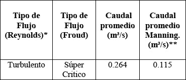 Como consecuencia del cálculo y promedio de caudal, se obtuvo las siguientes características para el flujo máximo de diseño. (Ver Tabla 3).
