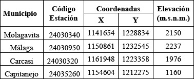 La información meteorológica utilizada corresponde a 4 estaciones pluviométricas pertenecientes a los municipios vecinos de Málaga, Molagavita, Capitanejo y Carcasi, ya que le municipio de San José de Miranda no cuenta con los datos de precipitación requeridos para el análisis. Partiendo de los valores de precipitación máximos obtenidos en 24 hrs esta se llevaron a cabo procesos de interpolación y triangulación espacial mediante la elaboración de isoyetas mensuales multitemporales, y con con ayuda de la herramienta [9] Spline que agilizó la determinación de los rangos de precipitación propios para el municipio y para el área de estudio con un periodo de procesamiento de 16 años.
