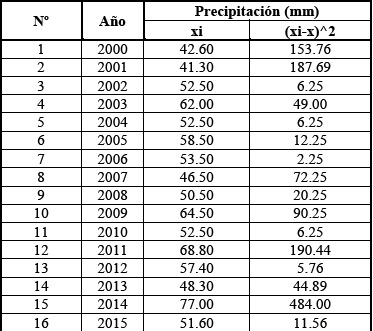 Al obtener los regimenes de precipitación mensual multianual, se procedió a identificar los mese con mayor precipitación a lo largo del periodo eveluado (16 años), hallando a su vez el año con mayor precipitación. Posteriormente se dio lugar al calculo de la precipitación maxima probable aplicando el metodo de probabilidad de Gumbel (Tabla 6).