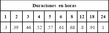 (mm), el cual multiplicado por cada uno de los coeficientes corresponde al tiempo de duración [15] (Tabla 9):