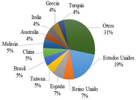 De los 84 documentos seleccionados se encontró que 29 eran artículos en revistas indexadas y 55 artículos en conferencias. Estos documentos fueron desarrollados por 33 países, siendo el 19% de los documentos propuestos por Estados Unidos y el 14% entre España y Reino Unido, cada uno con el 7%. Países como Brasil, China, Malasia y Taiwán tienen el 20% de las publicaciones (cada uno con el 5%), en tanto que otro 16% lo tienen Grecia, Italia, Turquía y Australia. Se tiene que los restantes los otros 22 países tienen el 31% de la producción identificada. Es importante resaltar que el único país de Latinoamérica detectado fue Brasil. En la Figura 1 se aprecia la distribución de documentos por país de origen.