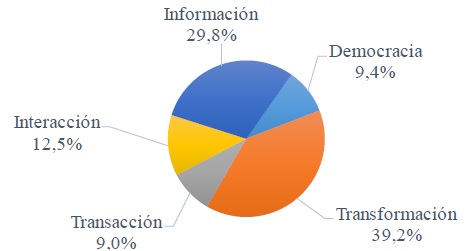Para las fases de interacción en línea y transacción en línea se detectaron el 21,5% de las variables e indicadores en estudio (en detalle, el 12,5% y 9% respectivamente). Estas mediciones se orientaron a la medición del uso de los canales de interacción, al tipo de interacción y la calidad de los servicios, y su disponibilidad para la fase de interacción. Para la fase de transacción su medición se centra al tipo de servicio, su calidad y los medios de pago empleados. Estos resultados evidencian la necesidad de ir midiendo el incremento en el uso de los servicios digitales ofrecidos por las entidades gubernamentales, así como la calidad de los mismos.