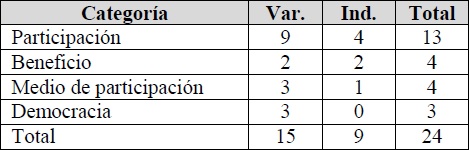 Finalmente, para la fase de democracia en línea se encontró que el 54,2% de las variables e indicadores miden aspectos de participación ciudadana y participación política para la toma de decisiones. Las categorías que miden los beneficios de los procesos de participación ciudadana y la evaluación de los medios de participación, tales como el voto electrónico, tienen cada una el 16,7% de las variables e indicadores. Así mismo, para la categoría democracia en línea se encontraron 12,5% de variables e indicadores.