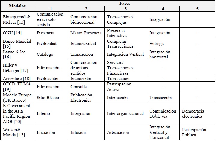 Por otra parte, para el desarrollo del e-gobierno se han propuesto varios modelos compuestos de fases que integran estrategias, personal, procesos y tecnología para poder llevar de forma exitosa su desarrollo e implementación. En la Tabla 1 se presenta una síntesis de algunos de los modelos de e-gobierno identificados por Vargas-Díaz [12].