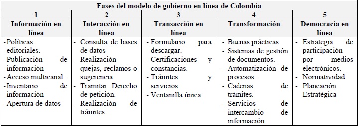 Particularmente, para el contexto colombiano también se ha definido un modelo de desarrollo de e-gobierno, el cual está compuesto de cinco fases. La primera fase es información en línea que busca se distribuya información a través de sitios web, la segunda fase es interacción en línea que propende por mayor interacción entre la administración, los ciudadanos y las empresas. La tercera fase es transformación en línea, en la cual se realizan trámites y servicios por transacciones electrónicas para la obtención de productos y servicios. Transformación en línea es la cuarta fase que hace referencia a los procesos de interoperabilidad, y la última fase es democracia en línea que busca la participación activa y colectiva de la ciudadanía en la toma de decisiones del Estado [13]. En la Tabla 2 se presenta una síntesis de las fases de desarrollo del –gobierno en Colombia.