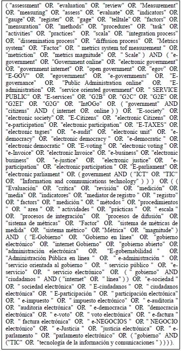 El periodo escogido fue de 2004 al 2014, y el tipo de publicaciones fue artículos y conferencias. La ecuación fue definida utilizando palabras y sintagmas asociados a evaluación y a e-gobierno. Se utilizaron 153 términos. La búsqueda se hizo en la base de datos SCOPUS en el título, resumen y palabras clave. Se obtuvieron 13.741 referencias. En la Tabla 3 se presenta la ecuación.