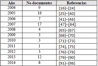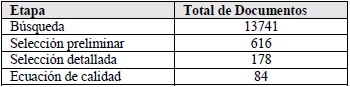 De acuerdo con la evaluación realizada se estableció que 84 documentos cumplieron con los criterios establecidos. Los resultados obtenidos en cada etapa de la investigación se presentan en la Tabla 4, y el listado de los documentos que cumplieron con el criterio de calidad por año se presenta en la Tabla 5.