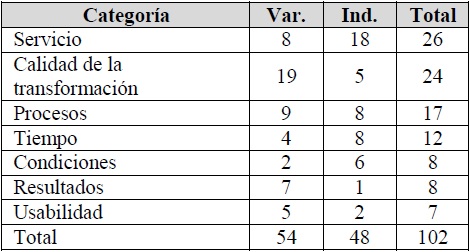 Con el fin de identificar las variables e indicadores propuestos en los 84 trabajos científicos seleccionados, se utilizó como guía metodológica la propuesta de [99], y para el procesamiento de estas mediciones se utilizó la herramienta desarrollada por [100]. El resultado de esta actividad permitió identificar 764 variables e indicadores.