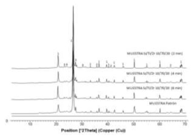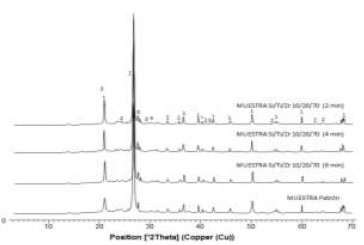 Los patrones de difracción por rayos X de las muestras cerámicas inmersas en las concentraciones Si/Ti/Zr: 10/20/70 y Si/Ti/Zr: 10/70/20 en función de los tiempos de inmersión a 2, 4 y 6 minutos se presentan en las Figuras 1 y 2, respectivamente.