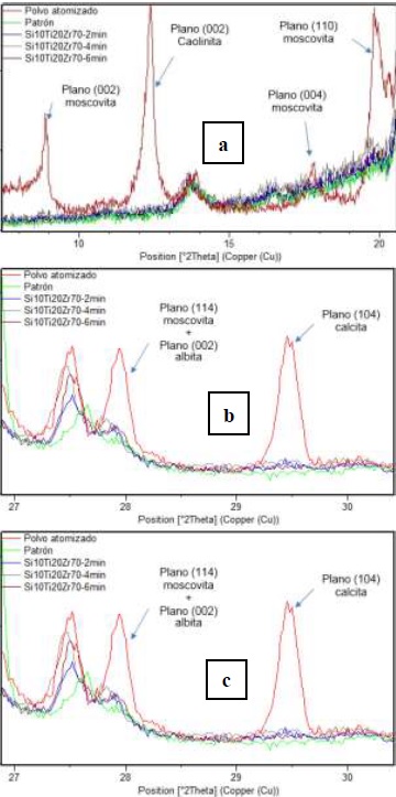 La Figura 3a muestra los cambios ocasionados sobre las fases arcillosas. La caolinita sufre una pérdida total de cristalinidad, este hecho se evidencia por la desaparición del principal plano de reflexión (001) en la posición 2θ cercana a 12,4°. En el caso de la moscovita se evidencian reducciones en el plano (002) en la posición 2θ cercana a 8,9° y en el plano (110) en la posición 2θ cercana a 19,8° tal como se aprecia en la figura 3a.