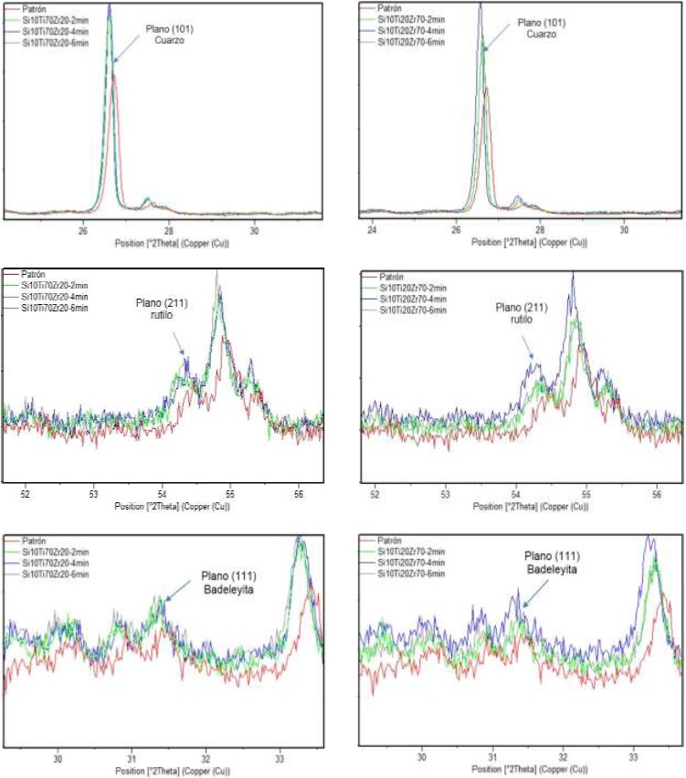 Asumiendo que no hay efectos de orientación preferencial en los cristales y que existe una relación directa entre la concentración de la fase con la intensidad de los planos de reflexión, se puede establecer el siguiente orden de concentración de la fase: patrón< Si10-Ti70-Zr20-2 min< Si10-Ti70-Zr20-4 min= Si10- Ti70-Zr20-6 min. Sin embargo, esta tendencia cambia para la solución con mayor presencia de zirconio el orden obtenido es el siguiente: patrón< Si10-Ti70-Zr20-2 min=Si10-Ti70-Zr20-6 min<Si10-Ti70-Zr20-4 min, con lo cual se puede inferir que el tiempo de inmersión “si” tiene un efecto en la formación de la fase rutilo en la muestra cerámica.