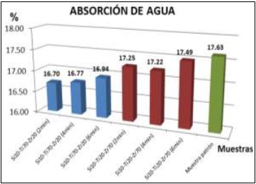 Este efecto obtenido, podría estar asociado a la disminución de la porosidad y por ende al porcentaje de absorción de agua de las muestras tal como se evidencia en la Figura 7. Se aprecia que las muestras inmersas en la solución Si10-Ti70-Zr20 presentan los valores de absorción de agua más bajo (disminución del 5,3% en el tratamiento Si10-Ti70-Zr20-2 min con respecto al patrón). Este resultado al ser asociado con los análisis de caracterización anteriormente presentados, conlleva a sugerir que una mayor presencia de titanio superficial en las formas identificadas (rutilo), favorece los valores de las propiedades tecnológicas del cerámico producido.
