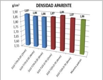 No se evidenció variaciones significativas en la densidad aparente de los materiales cocidos, que permita inferir mejoras en la resistencia mecánica de las muestras.