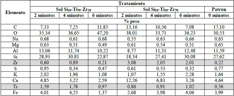 El análisis microquímico por EDX permitió tener mayor claridad sobre la cantidad de titanio y zirconio que puede ser retenido en los cerámicos. En el caso del sol Si10- Ti70-Zr20, rico en titanio, aparentemente un tiempo de 4 minutos permite tener una mayor concentración de dicho elemento. Para el caso de las muestras inmersas en el sol Si10-Ti20-Zr70 rico en zirconico, tiempos cortos de inmersión aparentemente permiten mejorar la retención del precursor de dicho elemento químico.