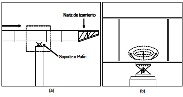 Un caso particular para el cual se usan vigas esbeltas de acero es en puentes. Si el método utilizado para instalar el puente es por medio de empujes sucesivos (Figura 1a), la viga estará sometida a una carga concentrada en la región del alma adyacente a los patines o soportes temporales durante su puesta en sitio, pudiendo presentarse una inestabilidad en el alma y una posible falla por pandeo localizado (Figura 1b).