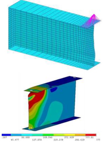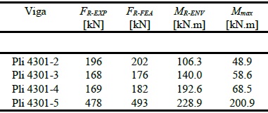 La carga fue aplicada mediante un desplazamiento controlado del nodo maestro y se utilizó el método de Riks para asegurar el trazado de la curva de equilibrio fuerza - desplazamiento ante la eventual presencia de pandeo en la viga. Luego de un análisis de convergencia el modelo final presenta una malla con 1056 elementos tipo shell. Los resultados parciales de esta validación se presentan en la Tabla 2, donde la resistencia a la flexión (MR-ENV) es calculada según la metodología presentada en el ENV 1993-1-4 [4] y el momento máximo (Mmax) se obtiene del diagram de moemnto de la viga.