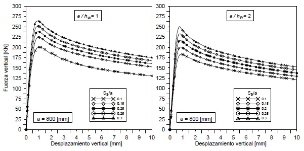 A continuación se presenta el comportamiento de vigas esbeltas al variar la longitud de aplicación de la carga desde un valor mínimo de 0.1 hasta 0.3 veces el ancho de la viga. Para los resultados de las simulaciones presentados a continuación, se fijaron los siguientes valores: a = 800 mm, tw= 4 mm, tf /tw = 2. En la Figura 5 se observa que al aumentar el área donde está aplicada la carga se aumenta la resistencia última de las vigas, independientemente de la relación de aspecto a/hw. Al aumentar la longitud Ss se garantiza una transmisión de la carga sobre el alma en un área mayor, logrando que la distribución de esfuerzos de membrana no se concentre en un área reducida y por ende se logre un aumento en la resistencia última. Para estas vigas, se obtuvo que la resistencia última según ENV 1993-1-5 [3] ocurre antes de que ocurra plastificación de las fibras del alma adyacentes a la región del ala donde está aplicada la carga.