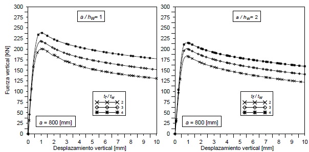 Para el estudio preliminar de la influencia del parámetro tf /twse reportan los resultados manteniendo el espesor del alma de la viga fijo e igual a 4 mm y una longitud de aplicación de la carga igual a 10 mm. En la Figura 6 se observa que al aumentar el espesor del ala tf proporcionalmente al espesor del alma de la viga tw se obtiene un aumento en la resistencia última de la viga ante carga concentrada. Este comportamiento se debe a que al aumentar el espesor del ala, el momento plástico necesario para que se produzca la formación de rótulas plásticas en la misma aumenta, retardando la aparición de líneas de fluencia en el alma de la viga y que se produzca el pandeo localizado de la misma. Este mecanismo de colapso plástico en el alma de la viga es ampliamente reportado por Lagerqvist [5].