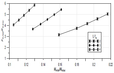 Otra manera de estudiar la influencia de tf /tw es observando la dependencia de la resistencia a flexión de la viga con este parámetro. En la Figura 7 se reporta la relación entre la carga máxima obtenida por el método de elementos finitos FR-FEA y la carga FR-ENV obtenida utilizando el procedimiento descrito en el ENV-1993-1- 4 [2] , en función del cociente entre momentos últimos (MR-FEA/MR-ENV) obtenidos de la misma manera. En el ENV 1993-1-5 [3], el momento último de flexión se determina utilizando la teoría de los anchos efectivos para placas esbeltas sometidas a flexión, en la cual se considera que toda la zona sometida a tensión es completamente efectiva y solamente una porción de la zona sometida a compresión contribuye a la resistencia a flexión debido a la falla prematura causada por pandeo localizado.
