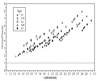 En la Figura 8 se reporta la distribución de la relación FRFEA / FR-ENVobtenida del análisis paramétrico en función de la relación de esbeltez de la vigas λ, siendo ésta una relación proporcional al cociente entre la carga de fluencia y la carga de pandeo elástico del alma [5], indicando con esto que al ser superior a 1, se garantiza una falla por pandeo localizado antes de que ocurra endurecimiento por deformación plástica de las fibras del material. A pesar de que los resultados mostrados en la Figura 8 se encuentran agrupados en función de la longitud relativa de aplicación de la carga, no se observa un patrón que determine cuando los valores de diseño son considerablemente menores respecto a los obtenidos numéricamente, por lo que para vigas geométricamente similares este factor de seguridad en el diseño por ENV- 1993-1-4 [2] no varía linealmente con la relación Ss /a.