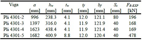 En primer lugar, se elaboró un modelo numérico no lineal usando el método de los elementos finitos. Elementos tipo shell fueron utilizados para modelar el alma, ala de la viga y rigidizador transversal. Cuatro vigas ensayadas experimentalmente por Unosson [4] fueron utilizadas para validar el modelo por elementos finitos. Las dimensiones de las vigas se muestran en la Tabla 1 con sus correspondientes valores de carga última obtenida experimentalmente.