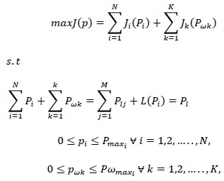 [1]Donde 𝑝𝑖 es la potencia suministrada por cada 𝐷𝐺𝑖 convencional; 𝑁 es el número de generaciones distribuidas; 𝐾 es el número de generaciones distribuidas renovables; 𝑃𝜔𝑘 es la potencia nominal para el 𝑘 − é𝑠𝑖𝑚𝑜 generador distribuido renovable; 𝑃𝑙 es la potencia total demandada por la microrred, incluyendo pérdidas; 𝑀 es el número de cargas; 𝑃𝑙𝑗 es la carga demandada del nodo 𝑗; 𝐿(𝑃𝑖 ) es la pérdida de potencia en la microrred; 𝑃𝑚𝑎𝑥𝑖 es la capacidad de generación nominal del 𝑖 − é𝑠𝑖𝑚𝑜 𝐷𝐺; 𝑃𝜔𝑚𝑎𝑥𝑖 es la máxima capacidad de generación del 𝑘 − é𝑠𝑖𝑚𝑜 generador distribuido renovable; 𝐽𝑖(𝑃𝑖 ) es la función de cada 𝐷𝐺 tradicional y, 𝐽𝑘 (𝑃𝜔𝑘 ) es la función de utilidad de cada fuente de energía distribuida renovable.