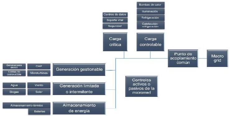 En la Figura 1 se muestran los elementos observados con mayor frecuencia en una microrred. Dentro de la generación se encuentran fuentes gestionables como las microturbinas, los generadores diésel y las celdas de combustible, y fuentes limitadas como las fuentes de energías renovables, principalmente. También se encuentran baterías como almacenadores de energía que se usan como medio de generación cuando es necesario.