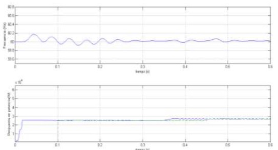 Acá se pueden observar dos cosas: por un lado, que el sistema de control mantiene al sistema dentro del rango de frecuencia y, por otro lado, que la condición de que la potencia demandada por el sistema sea igual a la potencia generada se cumple. Puede observarse, en la parte inferior de la figura, que el sistema responde a los cambios en la demanda, realizando el despacho y cumpliendo con lo establecido en cuanto a condiciones de suplir con la demanda.