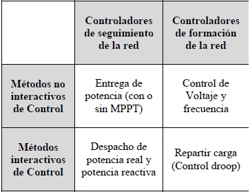 En [12], se presenta una clasificación de técnicas de control aplicables a microrredes en el que se establece una categorización general de las funciones de control para los DER, en el que se presenta una división entre control de seguimiento de la red y control de formación de la red, así como también entre estrategias interactivas y no interactivas.