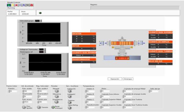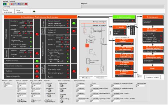 Se puede observar la Interface para el arranque del grupo. En esta, se puede apreciar los mandos para el arranque. También, indicadores que ilustran el estado de los equipos y variables.
