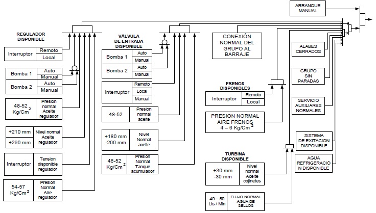 En la Figura 3 se muestra un diagrama lógico, con las condiciones preliminares que deben verificarse inicialmente con sus correspondientes estados y valores para los equipos, antes de realizar el arranque. Para la comprensión de los diagramas lógicos, en la Figura 4 se muestran las convenciones que se usan. Después, en la Figura 5 se muestra en un diagrama de bloques el procedimiento a seguirse para el arranque de un grupo.