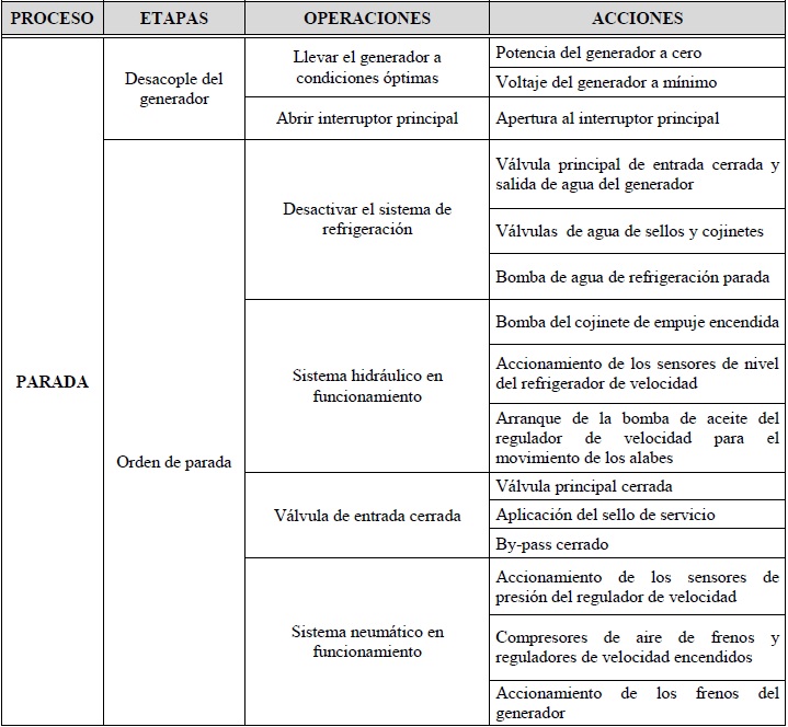 Una vez se da la orden de parada, el operador de la central hidroeléctrica debe verificar que se haga la siguiente secuencia: