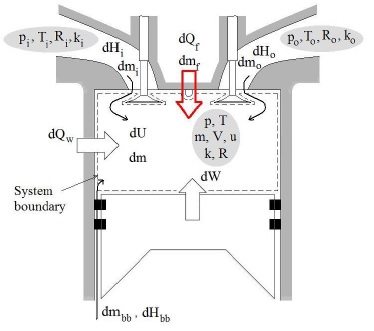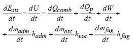 La variación de la energía interna del sistema en el motor de combustión interna es la resultante de la variación por unidad de tiempo del calor suministrado al sistema con el combustible (Qcomb) y la energía correspondiente a la carga de admisión (madmhadm), la energía convertida en forma de trabajo mecánico incluyendo las pérdidas mecánicas (W), el calor disipado a través de las paredes al refrigerante (Qp), la energía equivalente de los gases de escape referidos a las condiciones de admisión (meschesc) y la energía equivalente de los gases de la cámara fugados a través de los intersticios en los anillos (mfughfug).