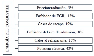 Se ha abordado la distribución energética de los motores de combustión de una manera general, a partir de algunas referencias reconocidas en la literatura y también de la sistematización de la información relacionada con los valores de energía disipada al refrigerante para un grupo representativo de motores, presentando una correlación para los calores disipados por el radiador del motor y el posenfriador del aire de admisión.