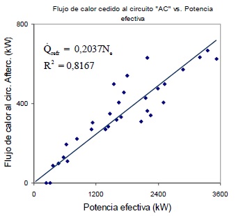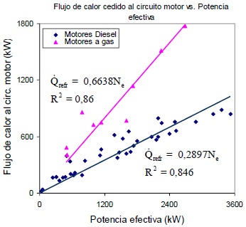 Observando las tendencias de control de la combustión y de la renovación de la carga del motor Diesel, y la gestión térmica en general del motor, la descomposición porcentual de la energía suministrada con el combustible en condiciones nominales de operación para el nivel de perfeccionamiento actual de los motores Diesel, se acerca a la descrita en la Figura 1. La figura incorpora las disipaciones de calor al refrigerante en los enfriadores de los gases de escape recirculados al cilindro y en el enfriador del aire (mezcla de gases) de admisión. El calor disipado a través de las paredes externas del motor no es fácil de evaluar. Procesando información provista en catálogos comerciales de grupos electrógenos, se han obtenido las gráficas mostradas en las Figuras 2 y 3, en las que se relaciona el calor disipado al refrigerante de algunos motores comerciales, discriminando los calores disipados directamente al sistema de refrigeración del motor y al posenfriador del aire de admisión.